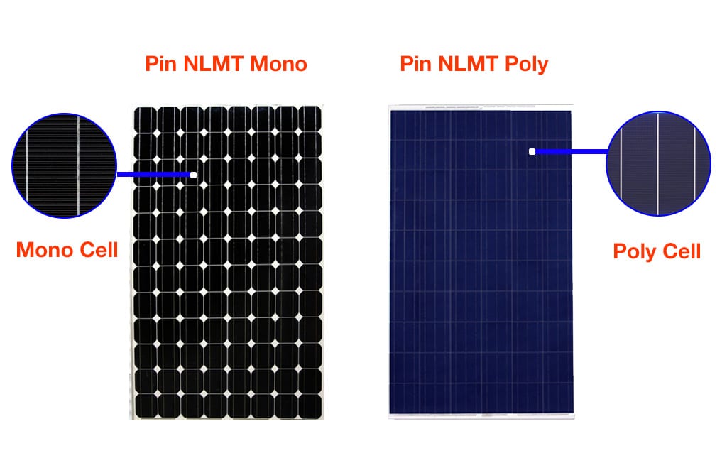 + Pin Poly (đa tinh thể): Được sử dụng rộng rãi trên thị trường, tuy hiệu xuất có giảm hơn so với Pin mono, nhưng giá thành rẻ. Được sử dụng tại các khu vực có bức xạ ánh sáng mặt trời trung bình lớn.