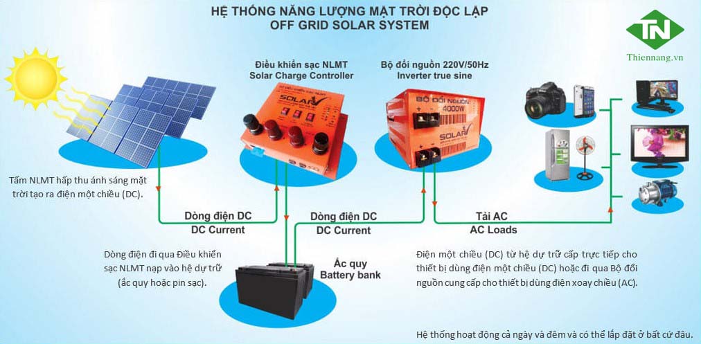 Inverter DC-AC: Sẽ nhận điện DC từ bộ điều khiển sạc để chuyển đổi ra điện cấp cho thiết bị. Tùy vào công suất hệ thống mà chọn Inverter phù hợp tránh quá tải.