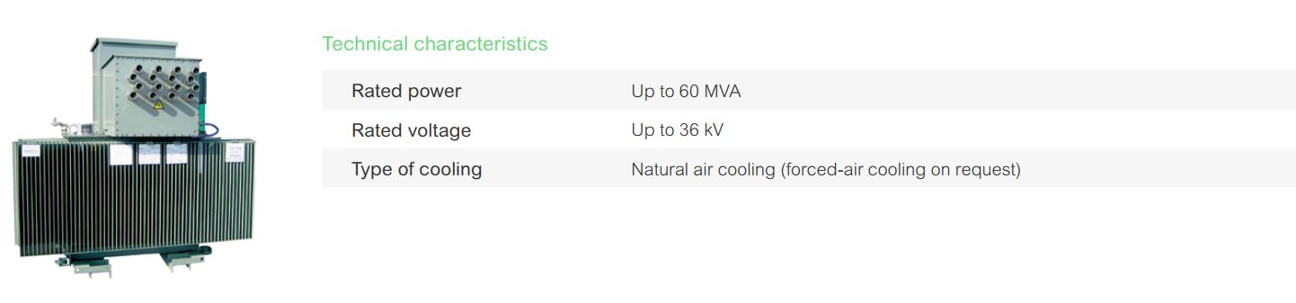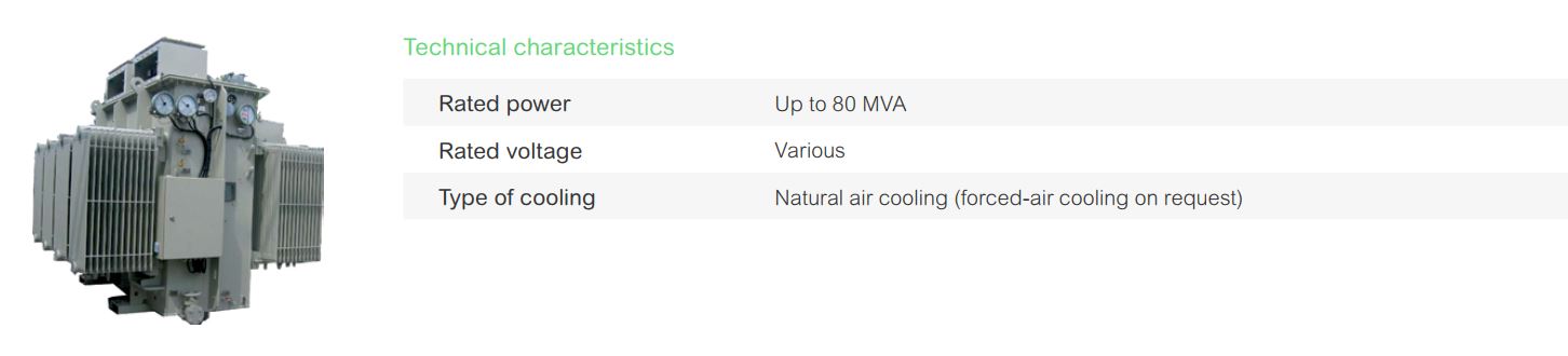 | Type of cooling | Natural air cooling, forced-air cooling (with fans), forced-oil cooling (pumped) or water cooling (oil/water cooler)* or ODWF (synthetic and biodegradable esters) on request |